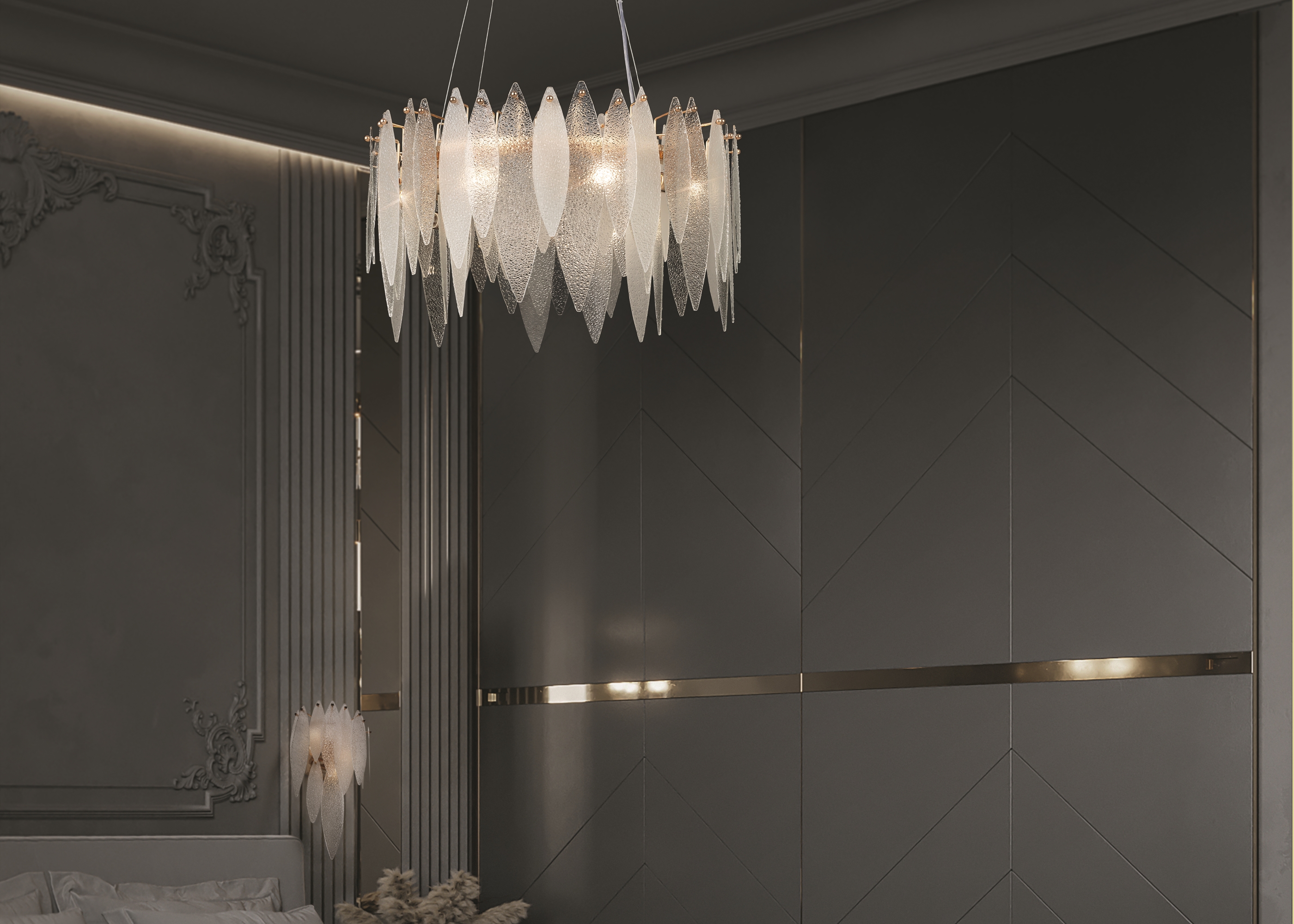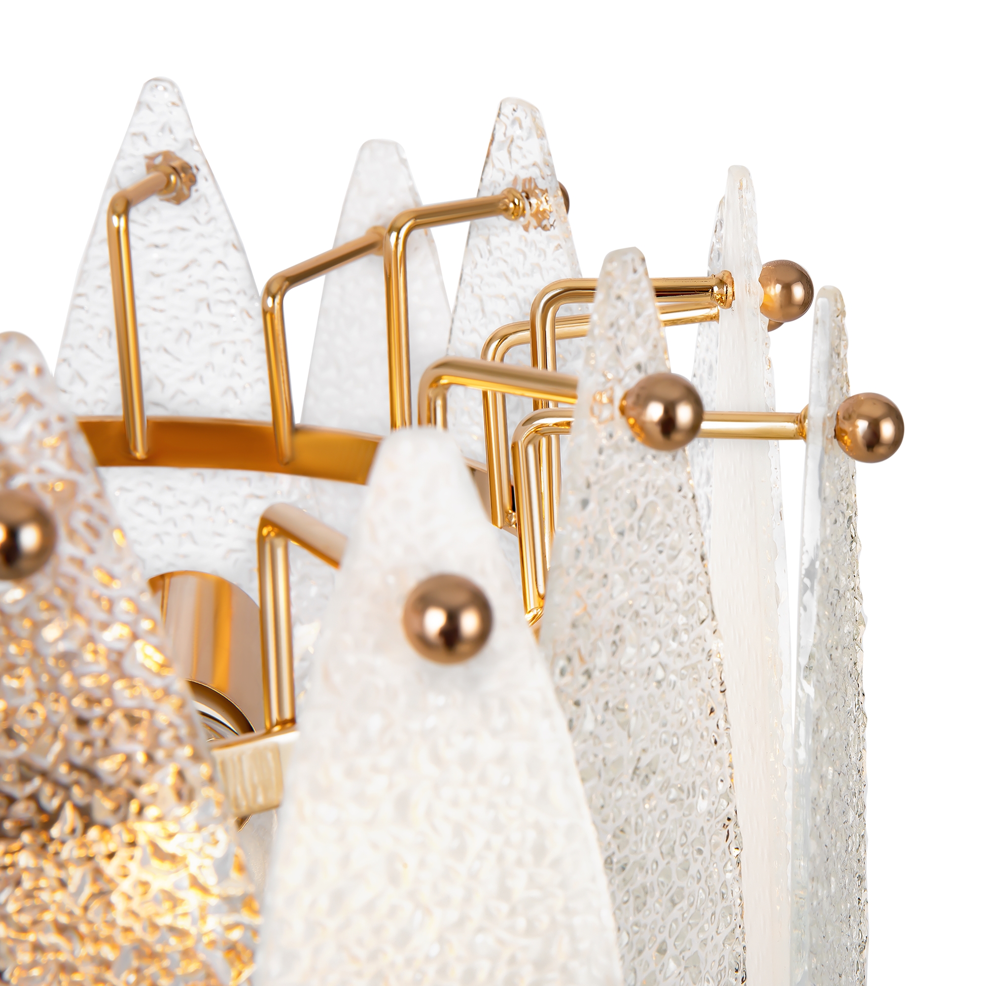 Металлическая арматура, цвет – французское золото. Декоративные элементы выполнены из прозрачного стекла в форме пестрых лепестков ледяной фактуры. Источник света – лампы с цоколем Е14, которые скрыты за декоративными подвесками, размещенными на металлической окружности. Высота подвесов регулируется.