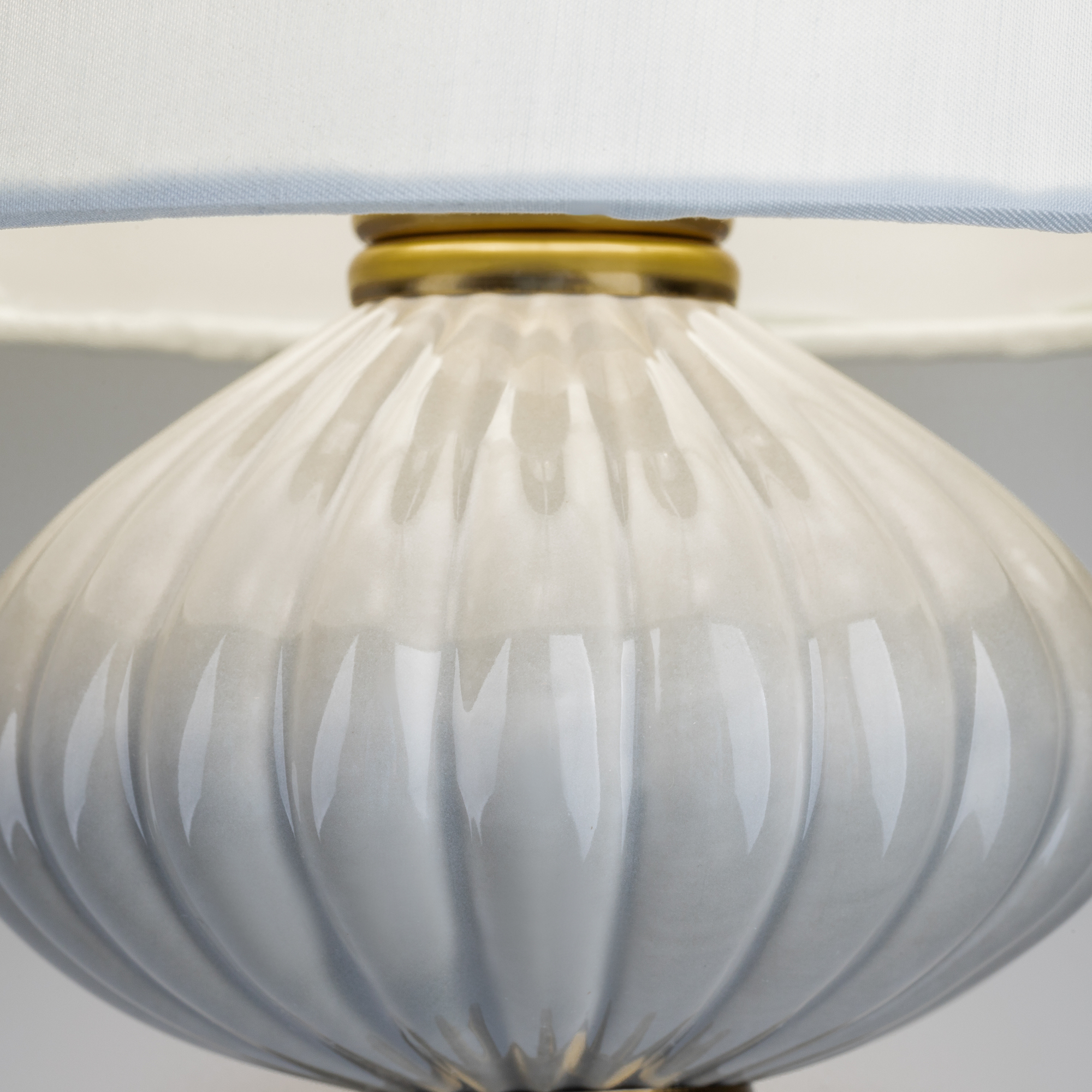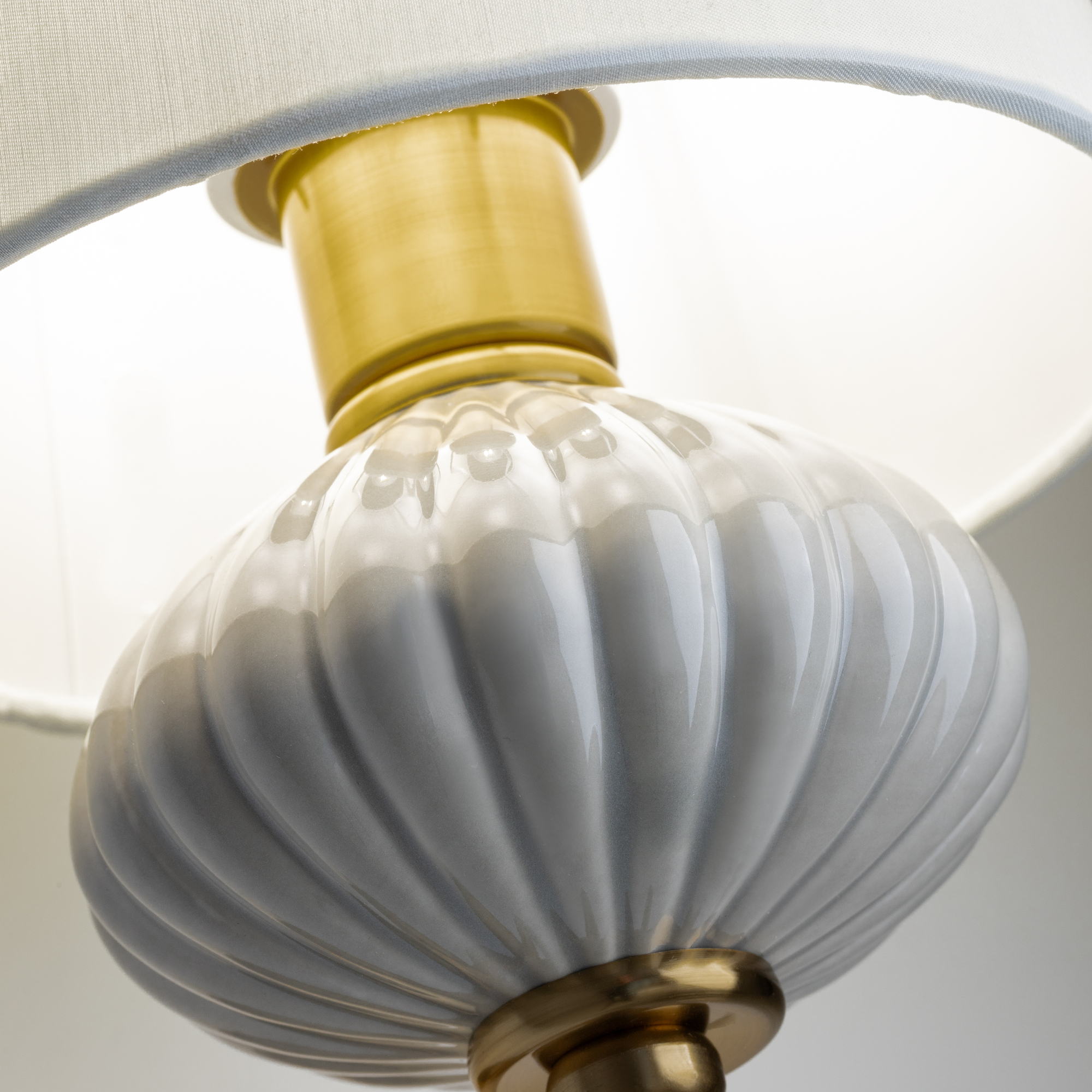 Металлическая арматура, цвет - латунь. Керамические декоративные элементы. Матовые белые абажуры. Силуэт светильника вытягивает интерьер. Источник света — лампа. Цоколь E14.