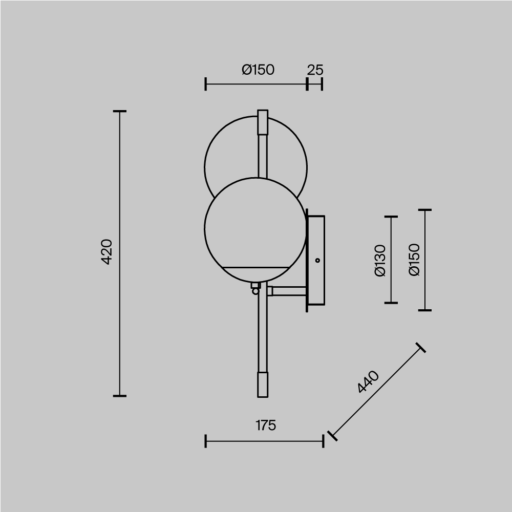 Арматура из металла в цвете матового золота. Плафоны-сферы из матового выдувного стекла. Модная асимметрия в дизайне. Источник света — лампы с цоколем Е14.