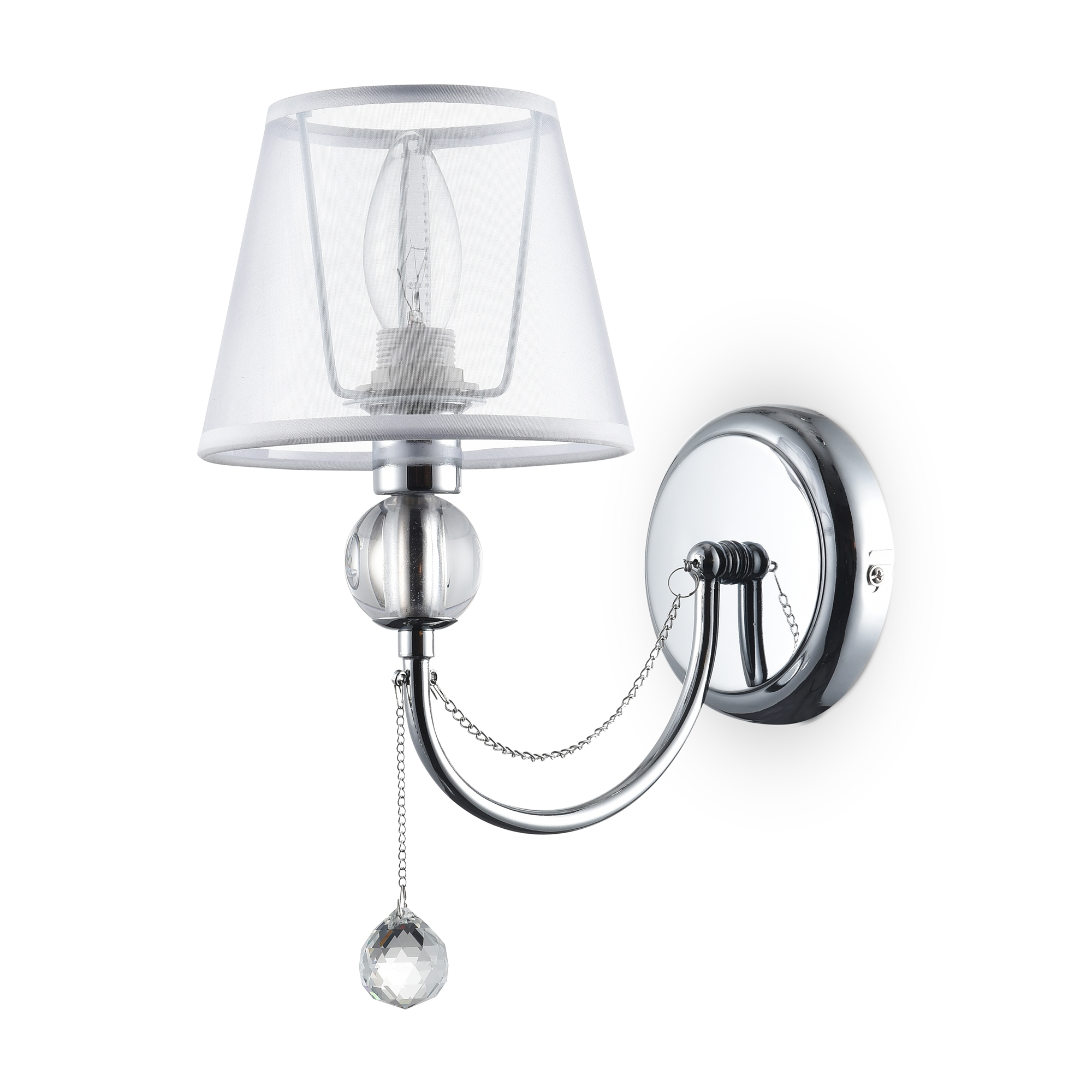 Светильники станут украшением интерьера, придадут ему шарм. Арматура светильников - из металла, а абажуры – из прозрачной органзы и ПВХ. Каждый из светильников серии дополнен тонкими серебристыми цепочками, а основания рожков украшены стеклянными прозрачными шарами. Завершающий элемент дизайна светильников Beverly – это декоративные подвески.