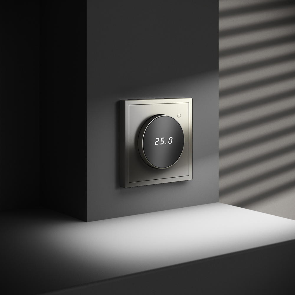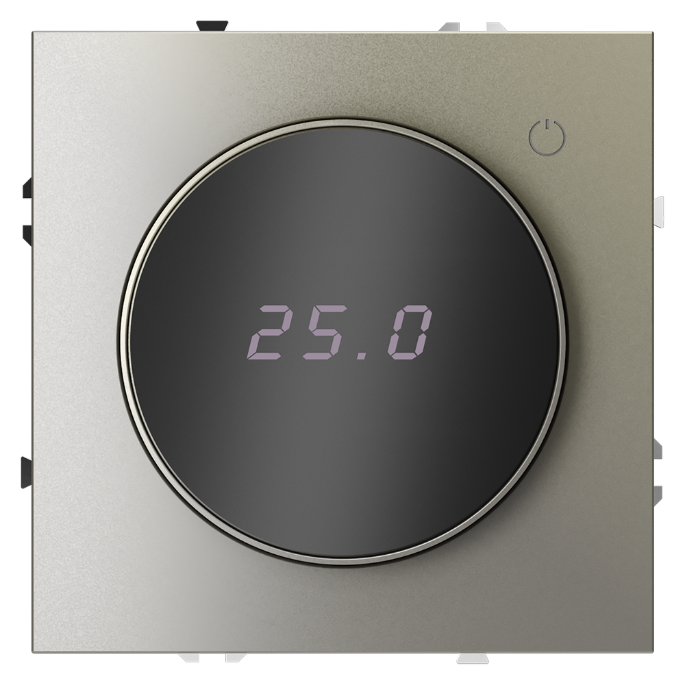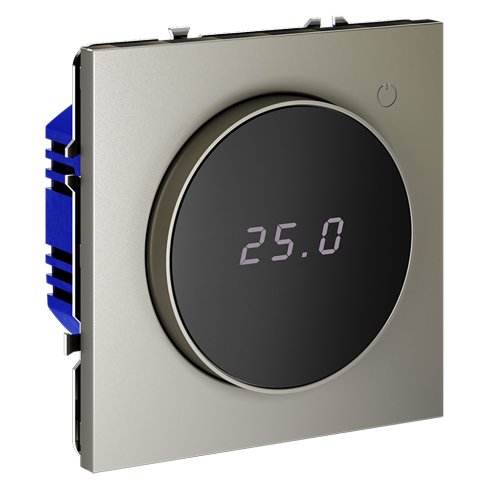 Место установки. Терморегуляторы Voltum предназначены для регулирования температуры электрического теплого пола. Актуальны как в городских квартирах, так и в загородных дачных домах без центрального отопления. Корпус. Дизайн терморегуляторов Voltum сочетается со стилем остальных электрических устройств компании. Они совместимы со всеми рамками S70. Материал внешних декоративных элементов — поликарбонат. Конструктивные особенности. Терморегулятор предназначен для работы с электрическими тёплыми полами различных типов и рассчитан на нагрузку до 3500 Вт. Устройство оснащено дисплеем, на котором отображается температура поверхности пола, обеспечивая удобный контроль системы обогрева. Устройства оснащены светодиодной индикацией режима и дисплеем, на котором отображается температура поверхности пола. Красный индикатор — «подача питания на нагревательный кабель (идет процесс нагрева)», отсутствие индикации — «заданная температура достигнута». В течение 15 минут после нагрева терморегулятор переходит в интеллектуальный «спящий режим», уменьшая яркость подсветки цифр и сокращая энергопотребление. Регулировка осуществляется вращением панели управления.  Терморегулятор поставляется в комплекте с механизмом из пластиковой накладки и датчиком температуры.