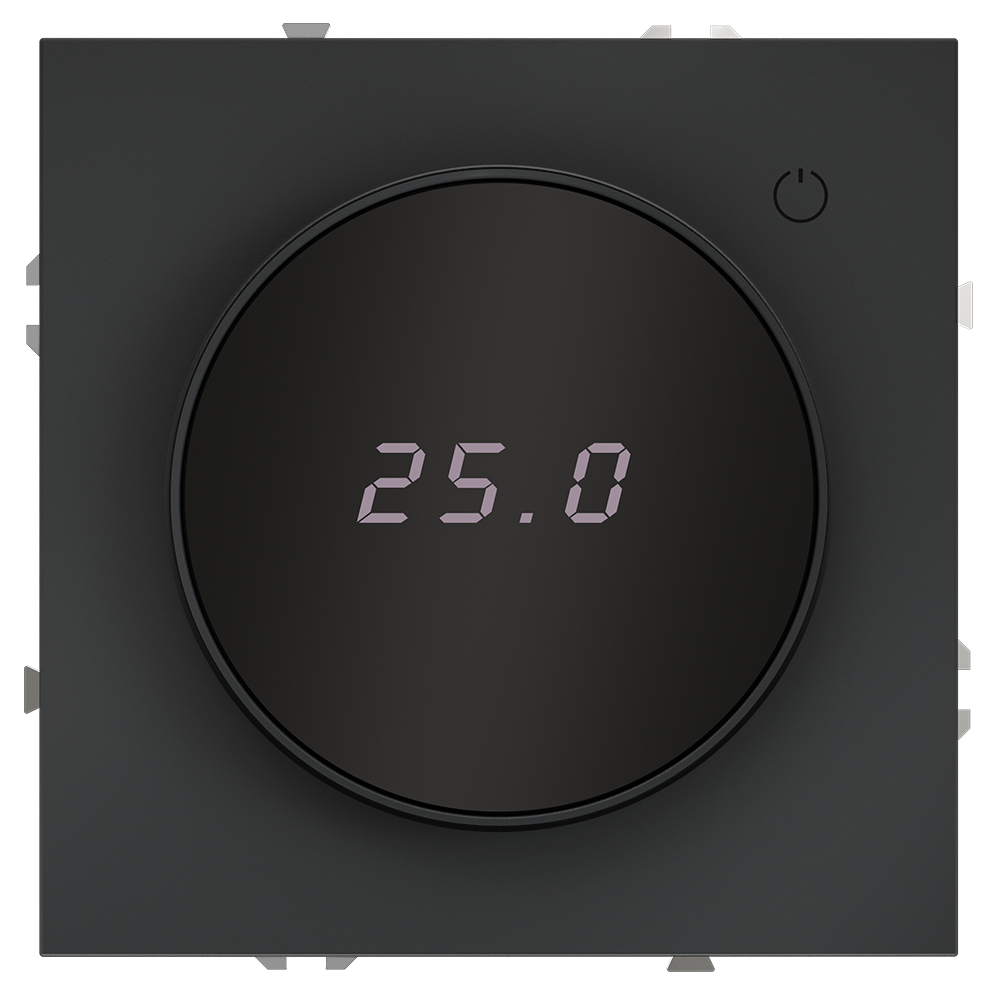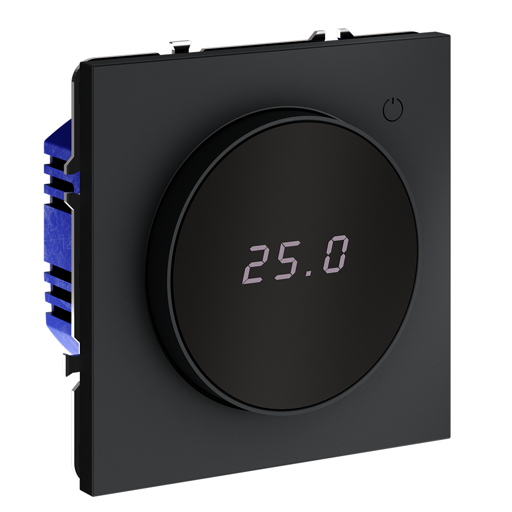 Место установки. Терморегуляторы Voltum предназначены для регулирования температуры электрического теплого пола. Актуальны как в городских квартирах, так и в загородных дачных домах без центрального отопления. Корпус. Дизайн терморегуляторов Voltum сочетается со стилем остальных электрических устройств компании. Они совместимы со всеми рамками S70. Материал внешних декоративных элементов — поликарбонат. Конструктивные особенности. Терморегулятор предназначен для работы с электрическими тёплыми полами различных типов и рассчитан на нагрузку до 3500 Вт. Устройство оснащено дисплеем, на котором отображается температура поверхности пола, обеспечивая удобный контроль системы обогрева. Устройства оснащены светодиодной индикацией режима и дисплеем, на котором отображается температура поверхности пола. Красный индикатор — «подача питания на нагревательный кабель (идет процесс нагрева)», отсутствие индикации — «заданная температура достигнута». В течение 15 минут после нагрева терморегулятор переходит в интеллектуальный «спящий режим», уменьшая яркость подсветки цифр и сокращая энергопотребление. Регулировка осуществляется вращением панели управления.  Терморегулятор поставляется в комплекте с механизмом из пластиковой накладки и датчиком температуры.