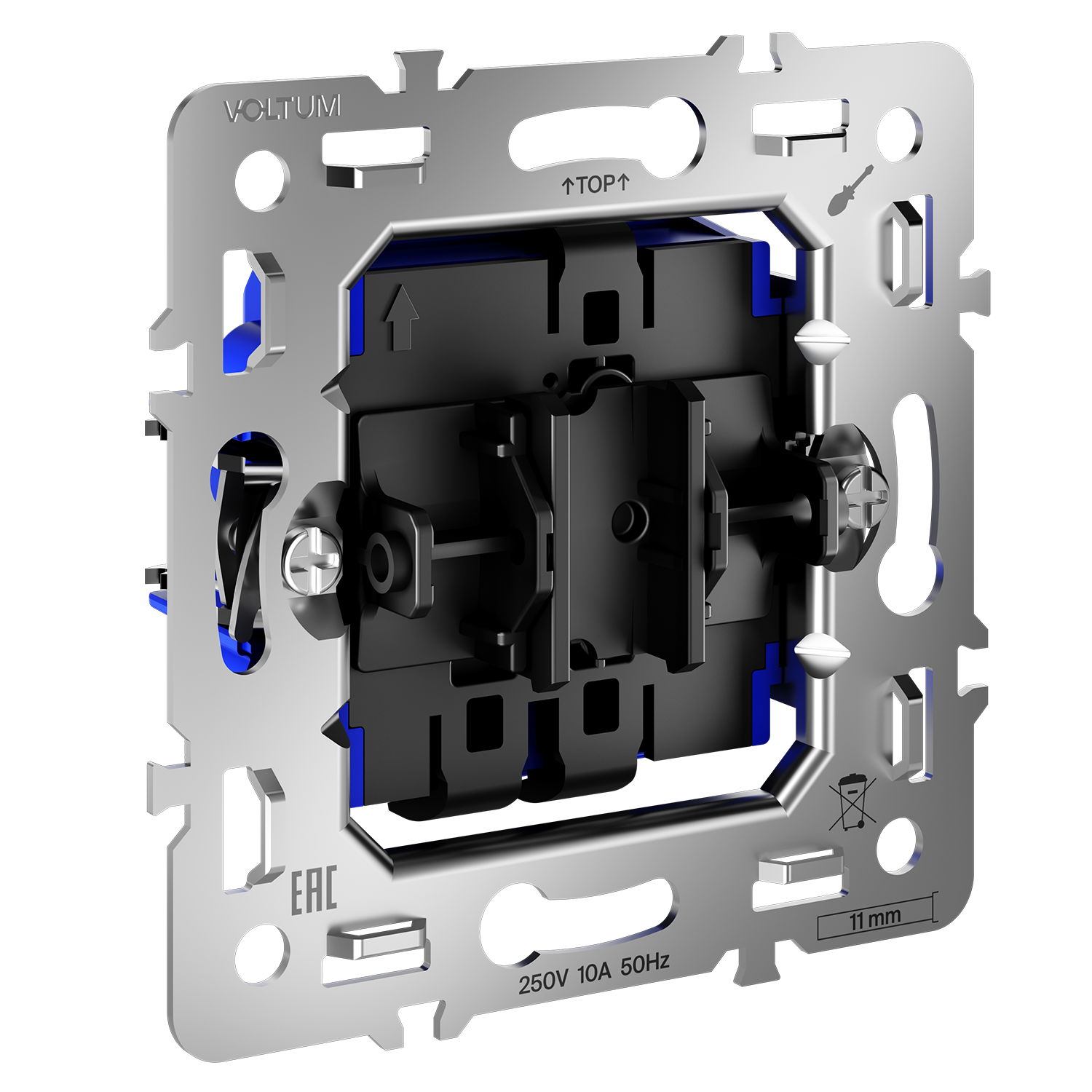 Место установки. Механизмы переключателей удобны в больших помещениях и длинных коридорах для управления освещением из нескольких мест. В ассортименте представлены два вида устройств: механизмы проходных переключателей (две точки) и механизмы перекрестных переключатей (три и более точек).  Конструктивные особенности. Все механизмы переключатей Voltum способны коммутировать нагрузку до 10 А. Для эффективной работы сети требуется заранее разработать схему электроснабжения с учетом установки переключателей в нескольких точках.