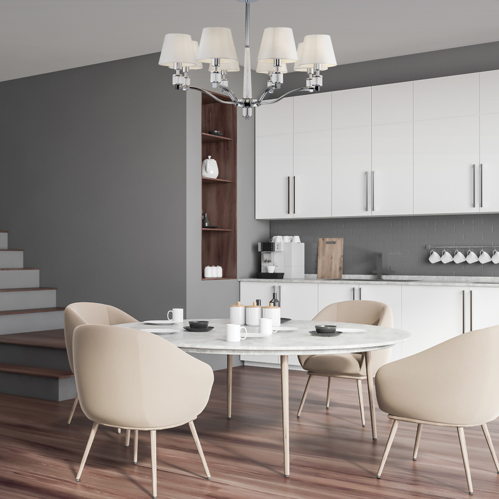 Серия классических светильников в светлой цветовой гамме. Изящные светильники могут стать хорошим дополнением интерьеров гостиных и спален. Дизайн арматуры дополнен декоративными элементами из прозрачного стекла. Абажуры сделаны из белой атласной ткани.