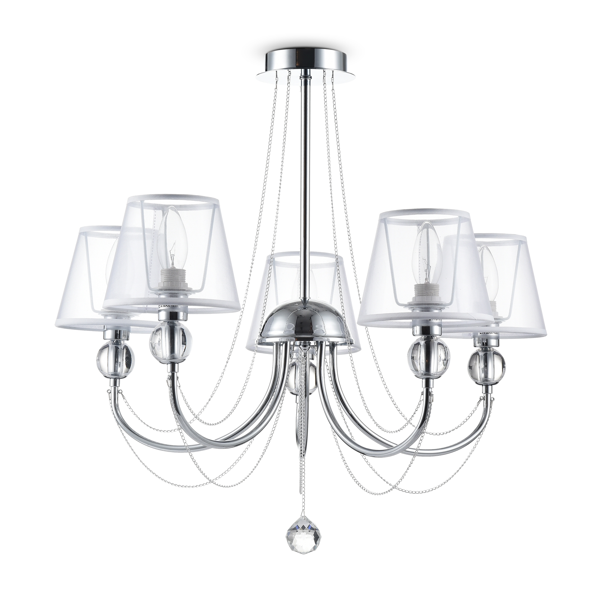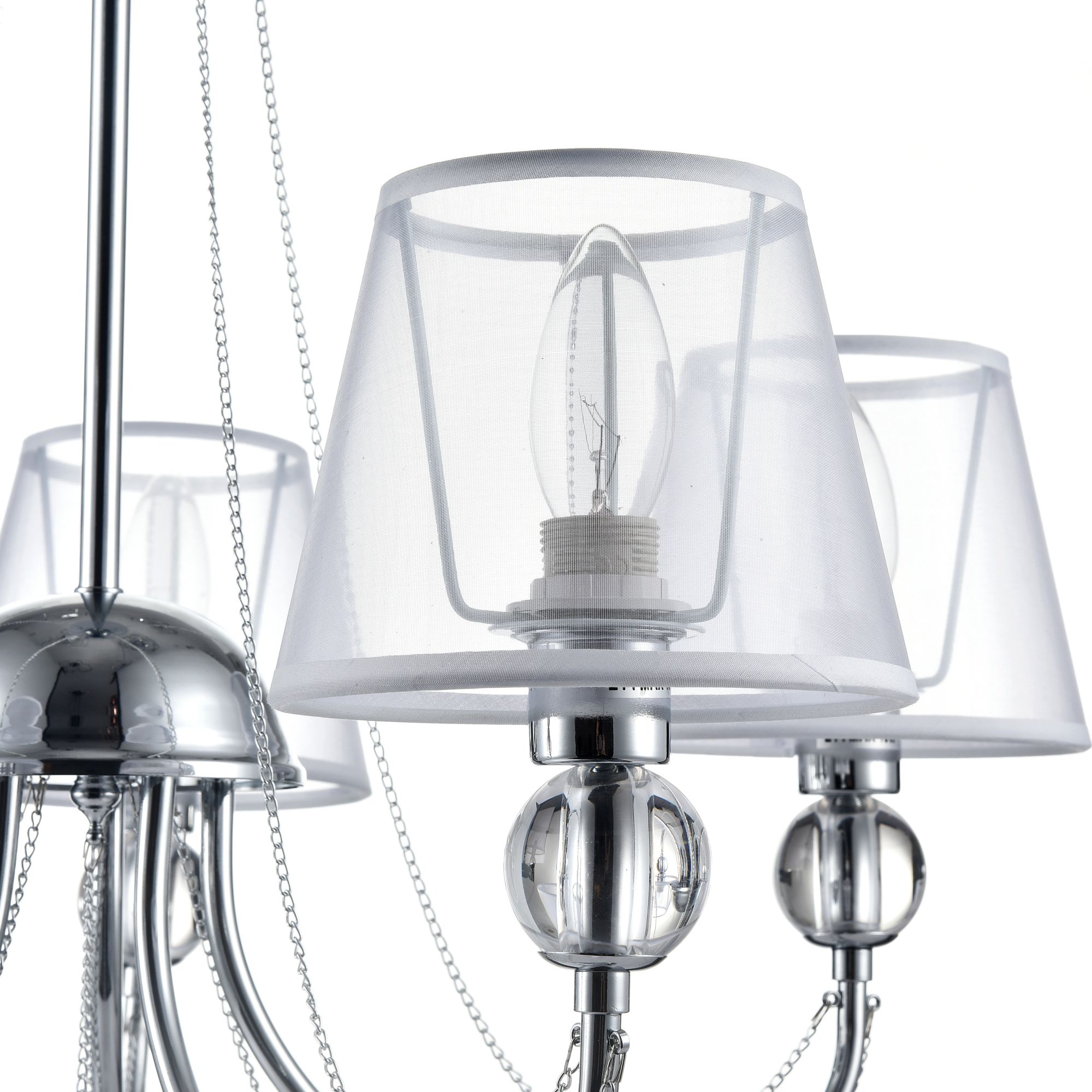 Светильники станут украшением интерьера, придадут ему шарм. Арматура светильников - из металла, а абажуры – из прозрачной органзы и ПВХ. Каждый из светильников серии дополнен тонкими серебристыми цепочками, а основания рожков украшены стеклянными прозрачными шарами. Завершающий элемент дизайна светильников Beverly – это декоративные подвески.