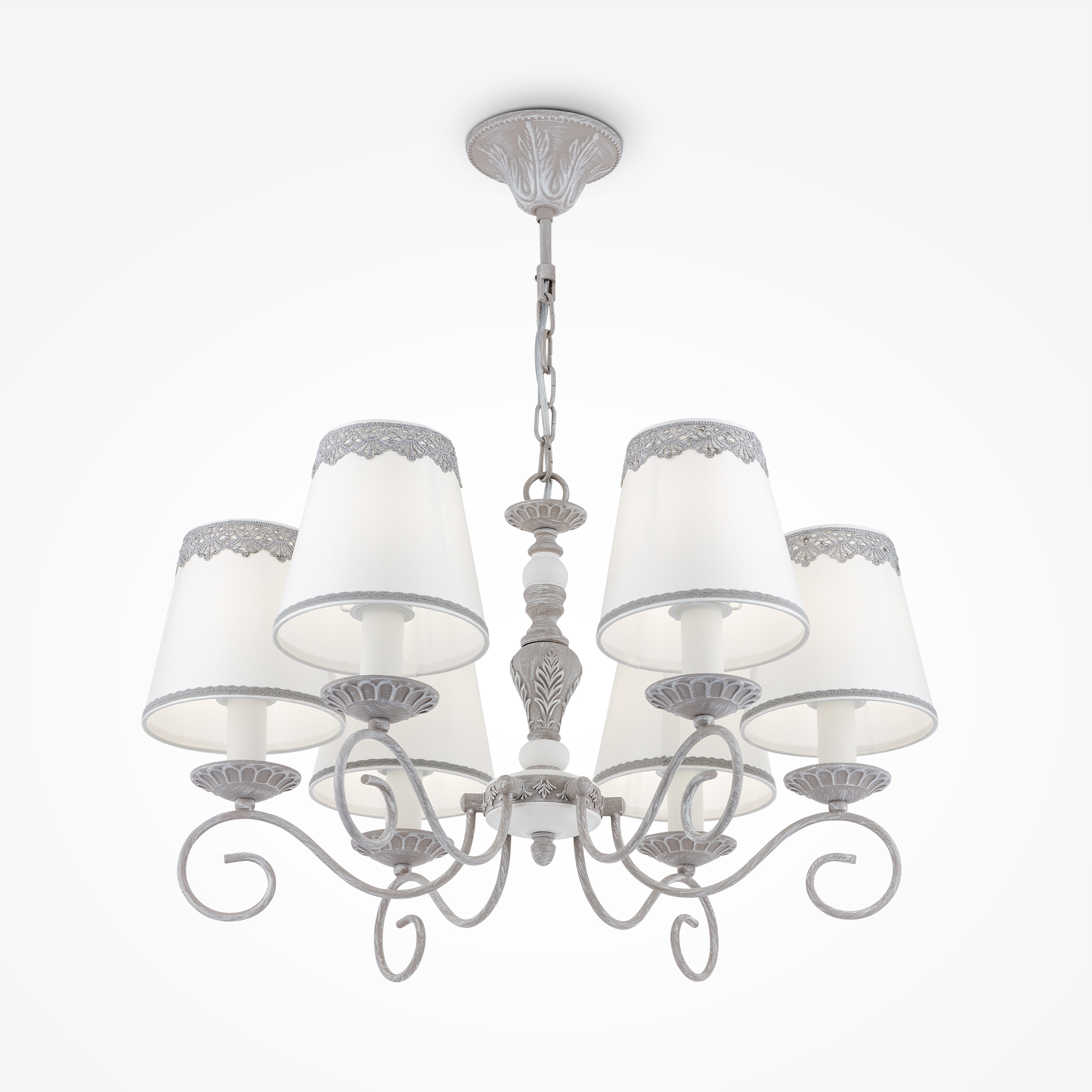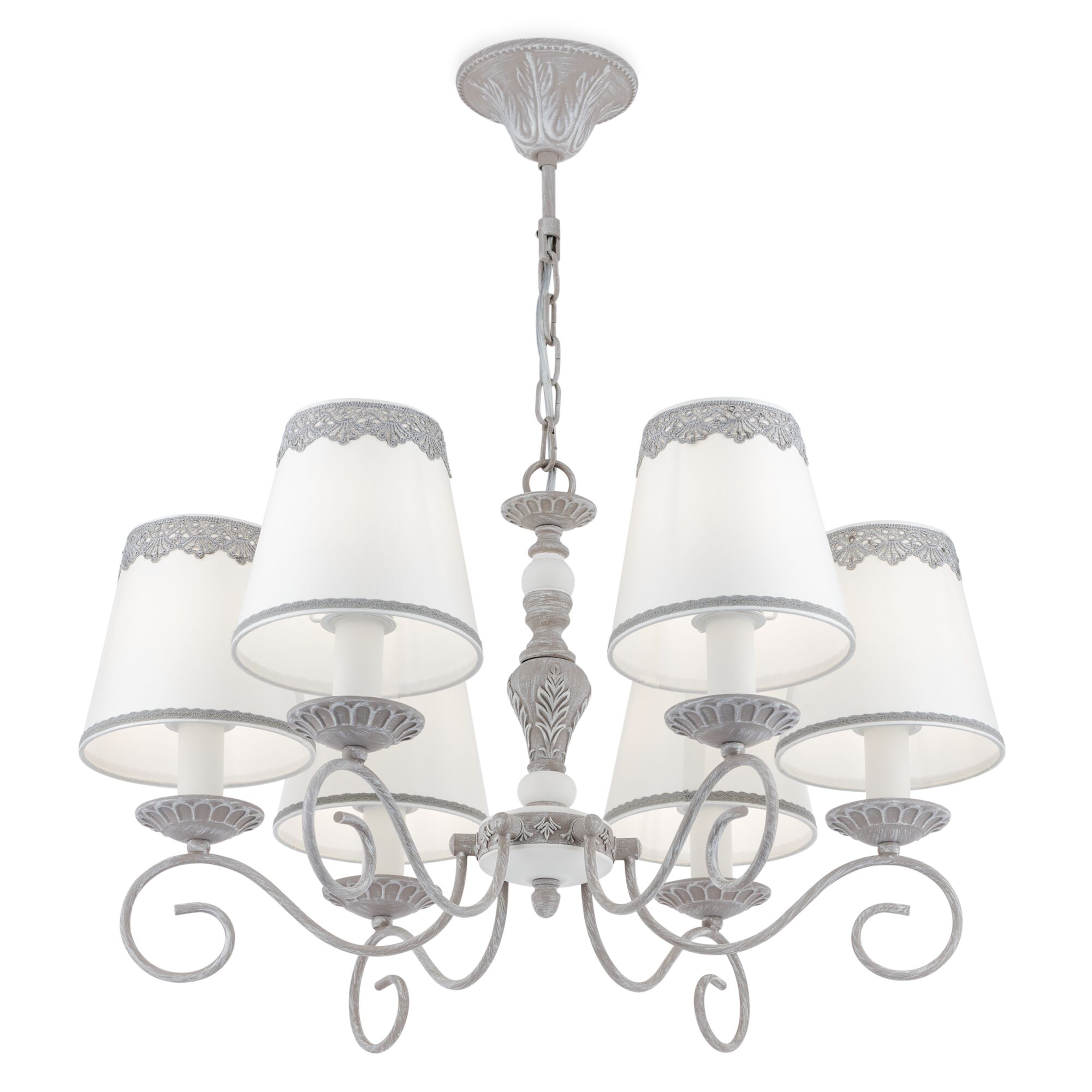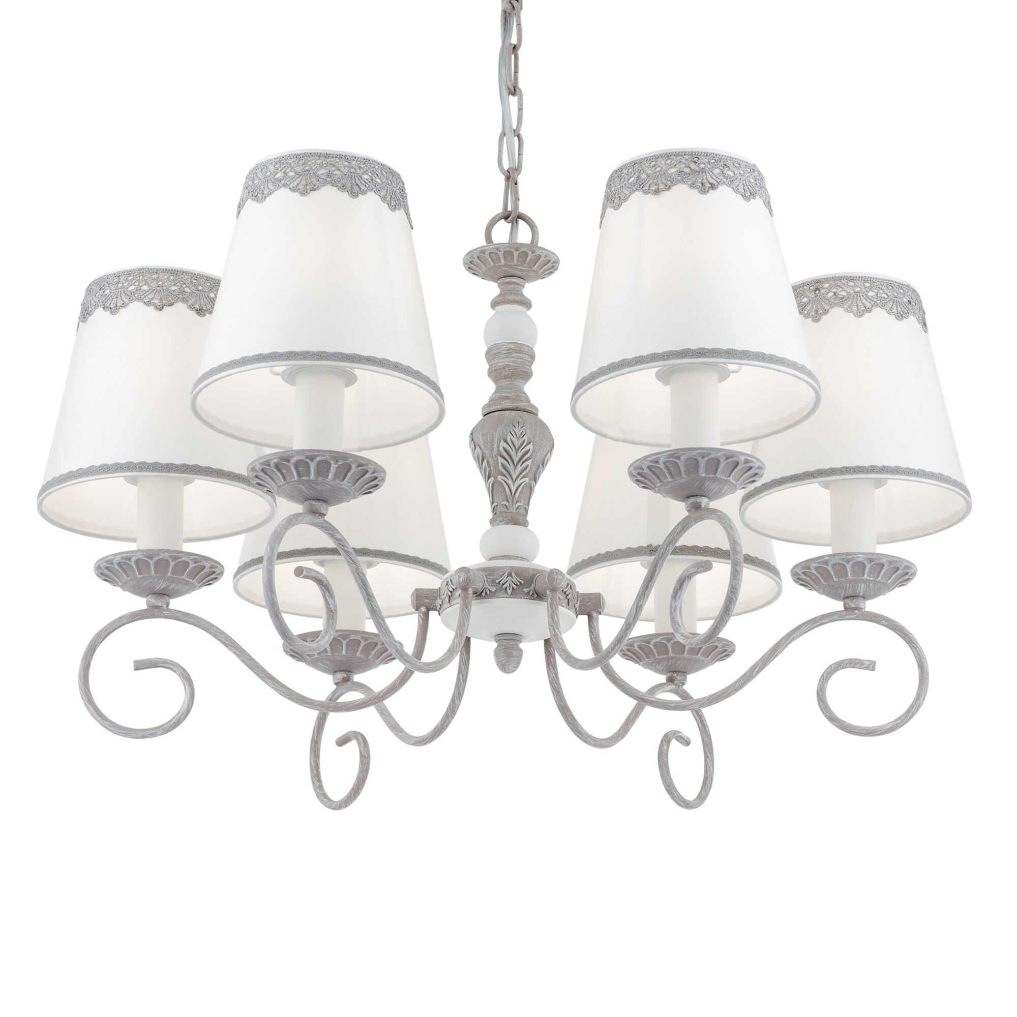 Арматура из металла в сером цвете, имитация естественных потертостей. Белые абажуры из хлопка на ПВХ. Кружевная окантовка. Декоративные элементы: рама для фото у настольной лампы:, фигурки птиц. Регулируемая высота подвесных светильников. Источник света - лампа с цоколем Е14. У торшера - Е27.