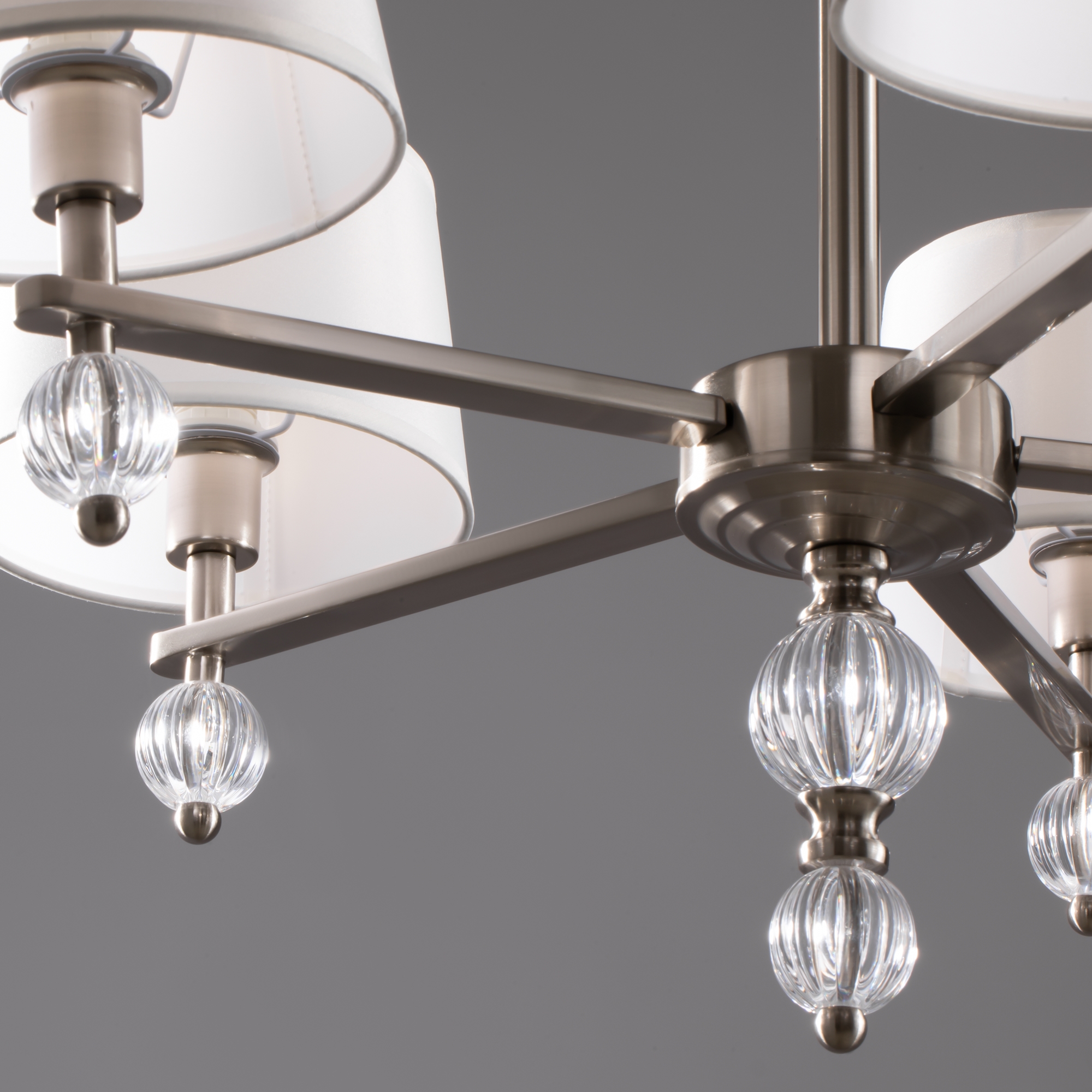 Серия светильников для интерьеров гостиных, спален и офисов в современном стиле. Арматура из метала цвета “никель” дополнена декоративными элементами из прозрачного акрила (шарики). Белые абажуры из текстиля на ПВХ.