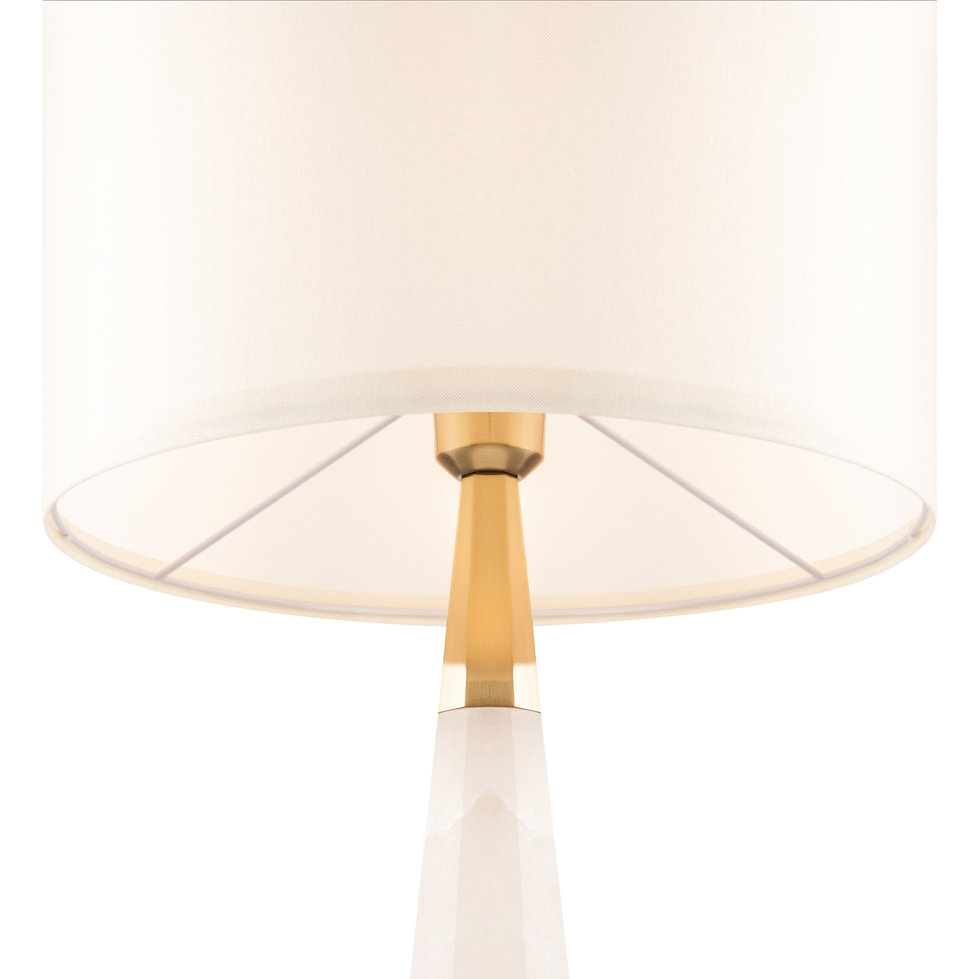 Металлическая арматура, цвет – латунь. Абажур – белый хлопок. Изюминка дизайна – элементы из натурального камня (алебастра). Трендовый микс фактур. Лаконичные формы в американском стиле. Источник света - лампа с цоколем Е14.
