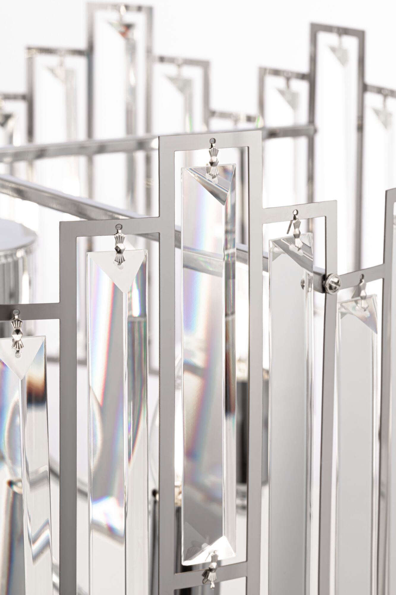 Хромированная металлическая арматура. Декор – прямоугольные кристаллы из прозрачного хрусталя. В качестве источников света используются лампы с цоколем Е14.
