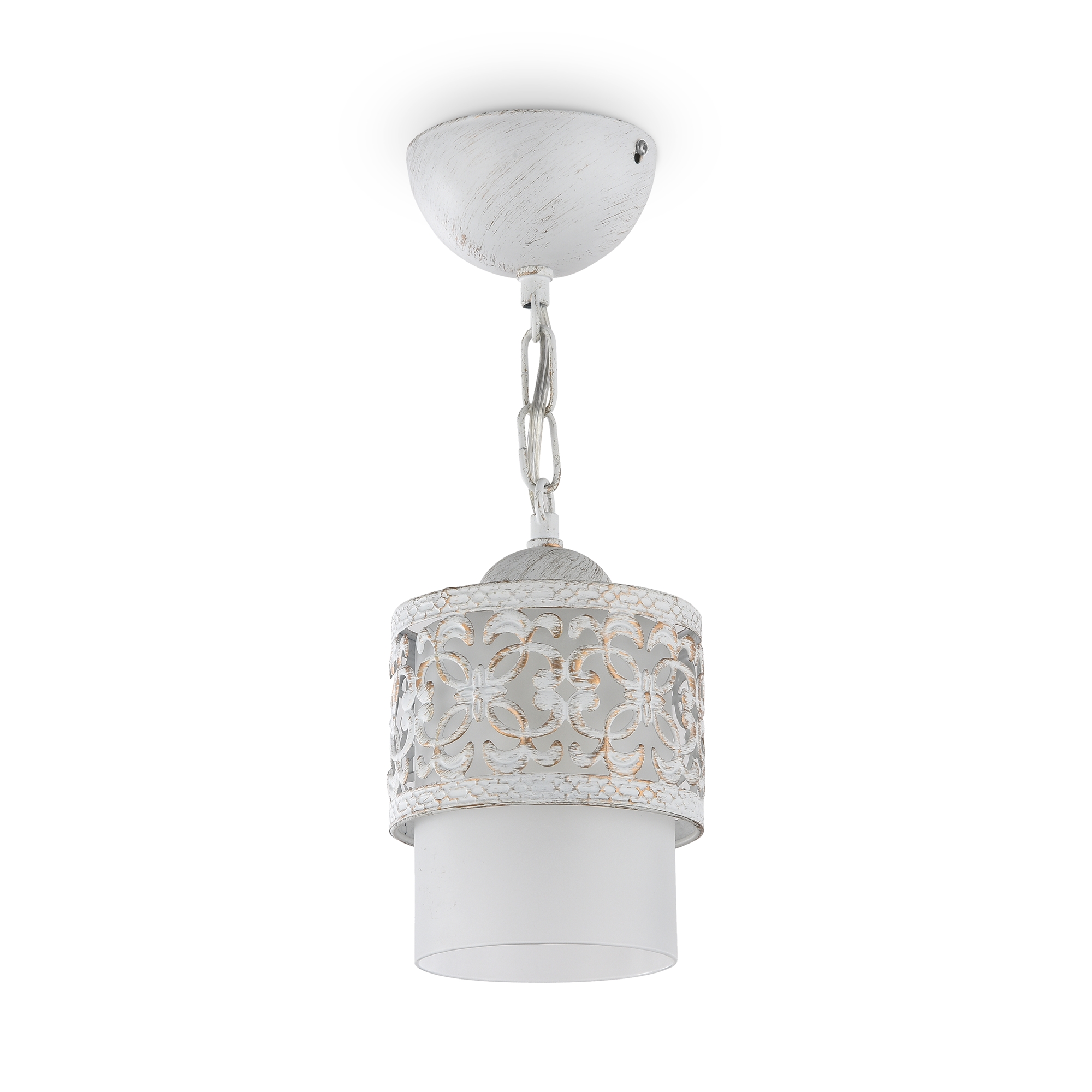 Подвес имеет два плафона: плафон из матового стекла и декоративный металлический плафон с ажурным узором и фигурной чеканкой на ободке. Цвета арматуры и металлического декоративного плафона - французское золото, античная бронза и белый с золотистым патинированием.