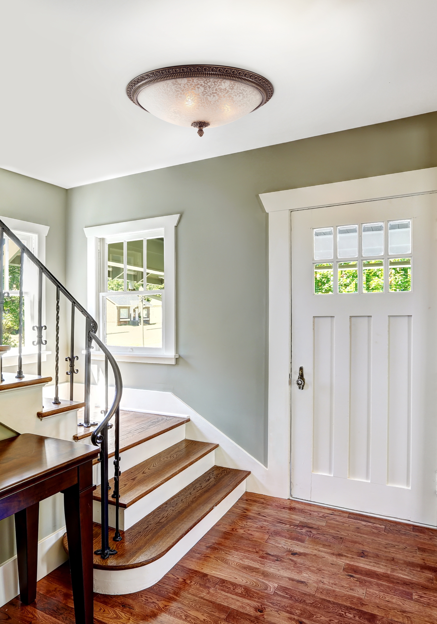 Металлическая арматура, оттенки – античная бронза, белый с золотом. Плафон – матовое стекло, пескоструйный рисунок. Обод и наконечник с прессованным орнаментом.