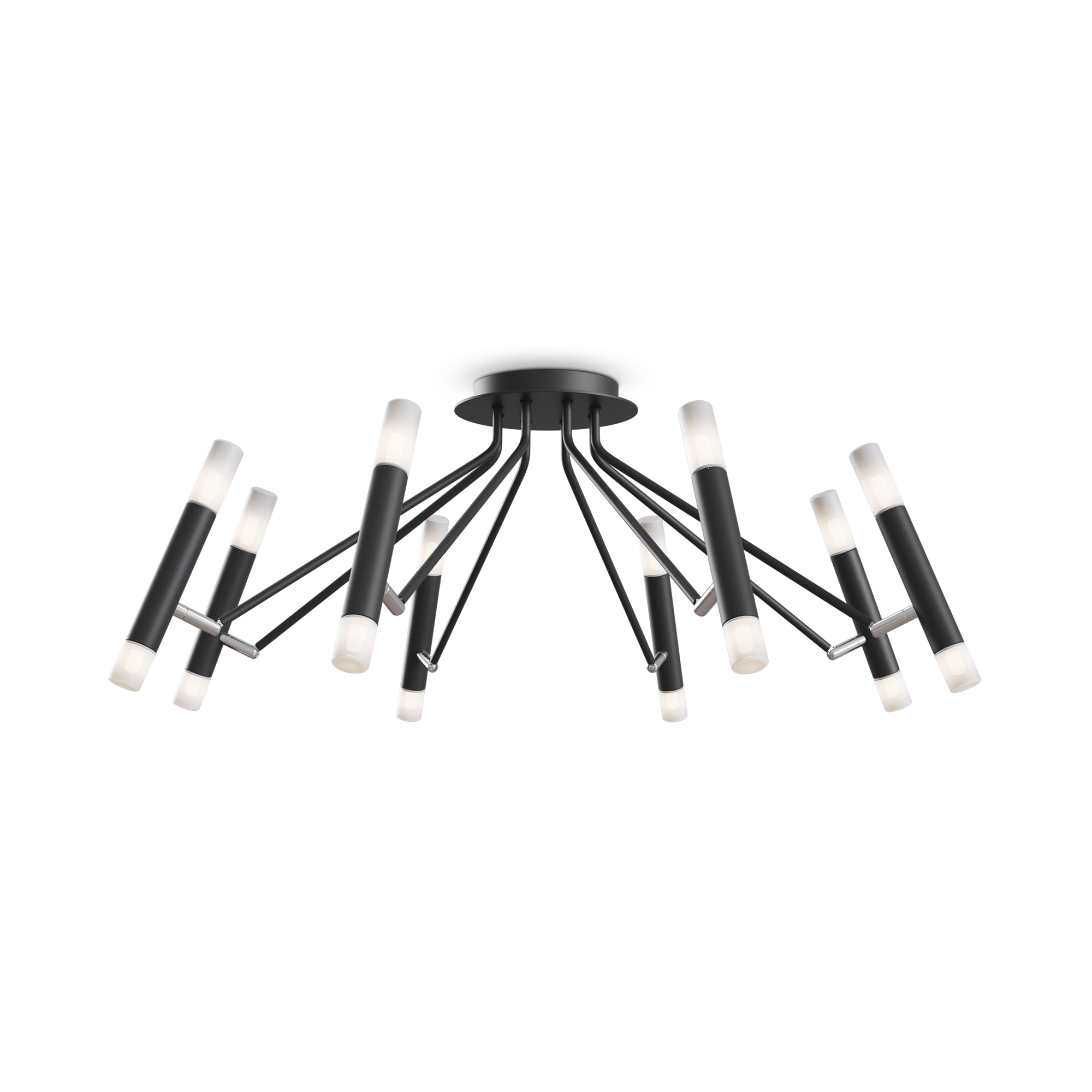 Металлическая арматура в матовом черном цвете. Цилиндрические плафоны вра щаются на 340° по горизонтали и 90° по вертикали. Возможность видоизменять дизайн светильника. Рассеиватель из матового стекла.