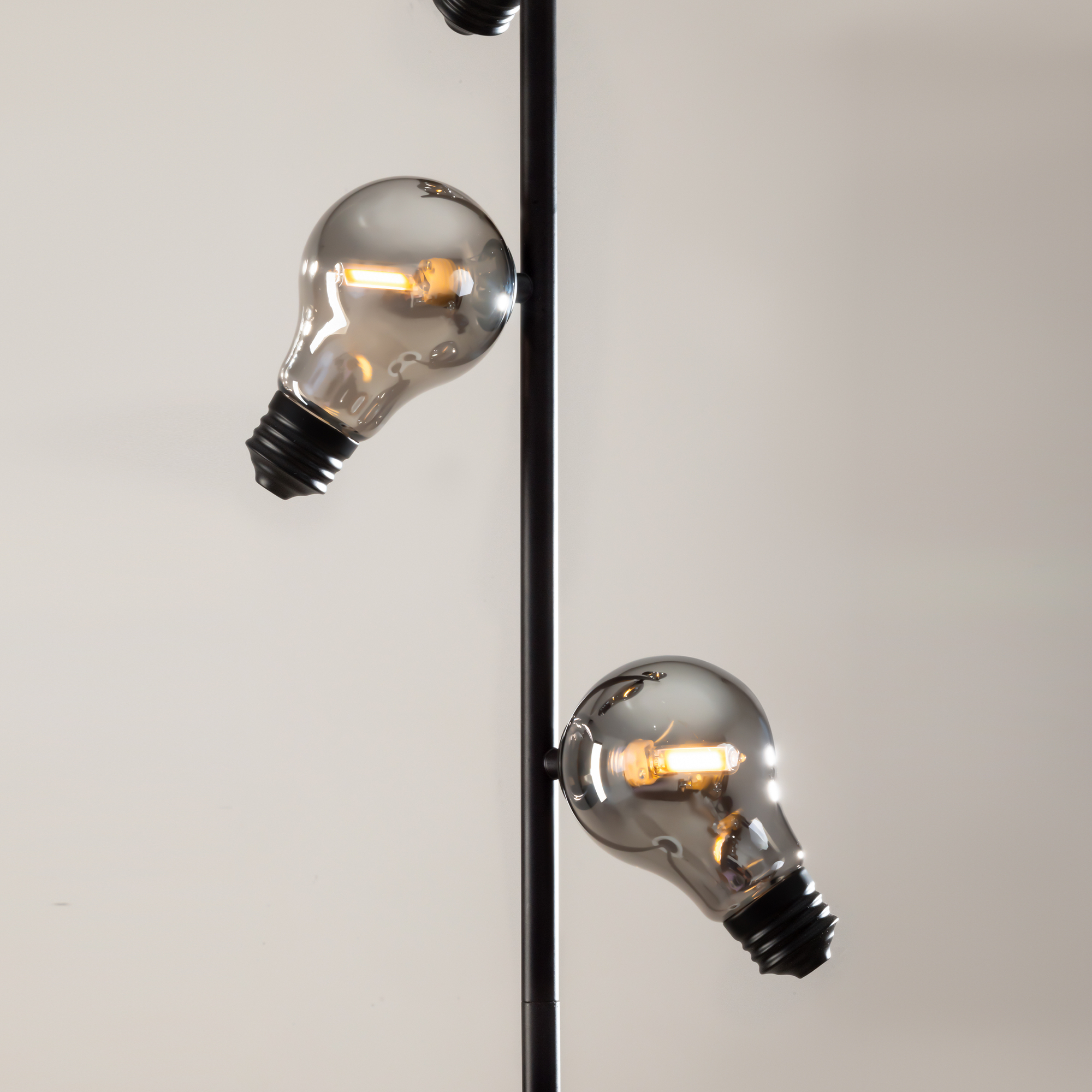 Металлическая арматура, цвета — чёрный и латунь. Прозрачные плафоны-лампочки из стекла в тон арматуры хаотично “разбросаны” по острову светильника. Подвесы регулируются по высоте. Источник света — лампа с цоколем G9.