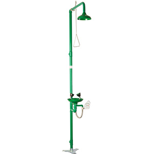 Аварийная душ предназначен для заводов, фабрик, лабораторий, где есть риск нанесения здоровья рабочему персоналу от огня, кислот, и прочих химических или радиоактивных реагентов. Раковина приводится в действие с помощью бокового рычага, душ с помощью ручки.