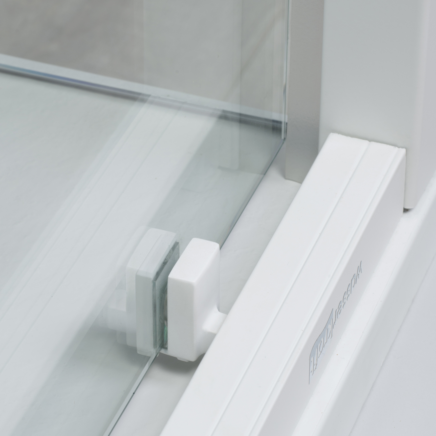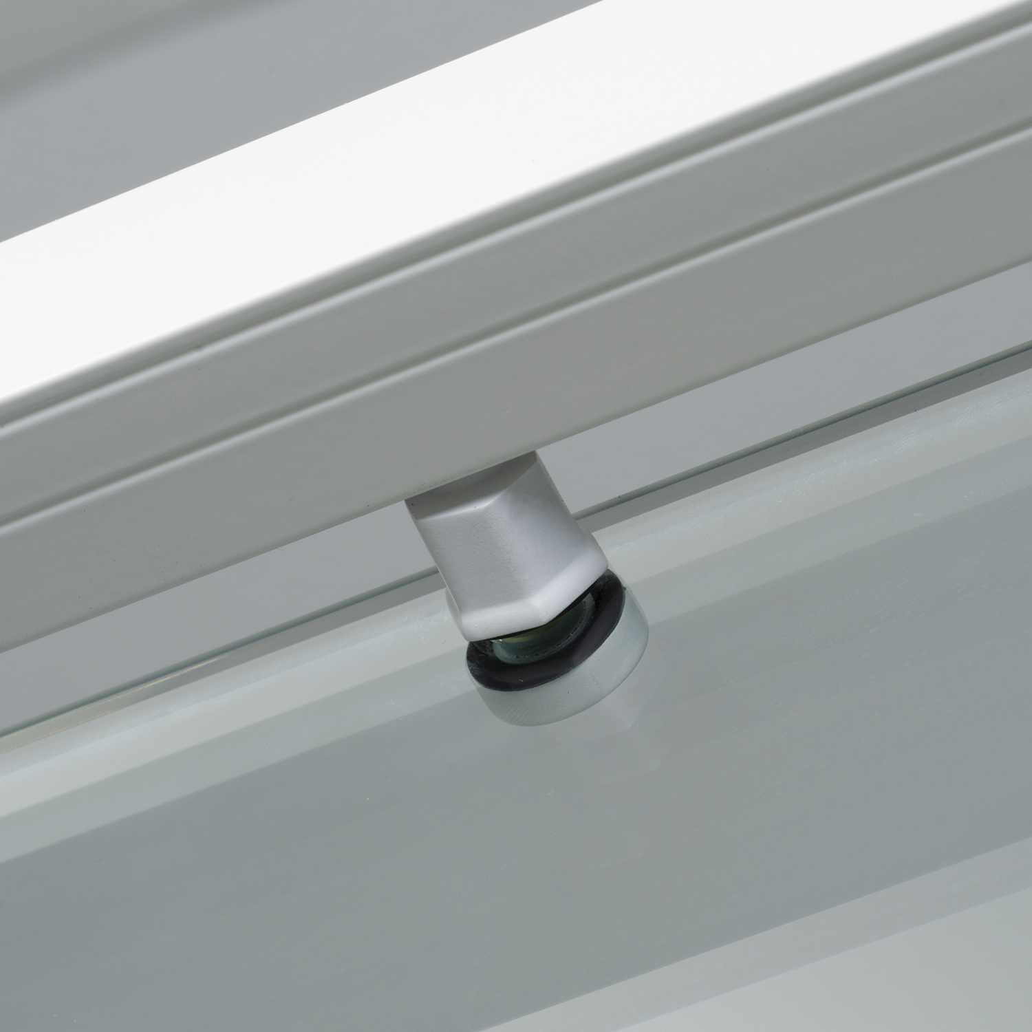Система отстегивания душевых дверей, дает возможность легкого ухода за всеми деталями изделия. Достаточно нажать кнопку на нижних роликах с внешней стороны душевого уголка и отодвинуть дверь от профиля во внутрь.