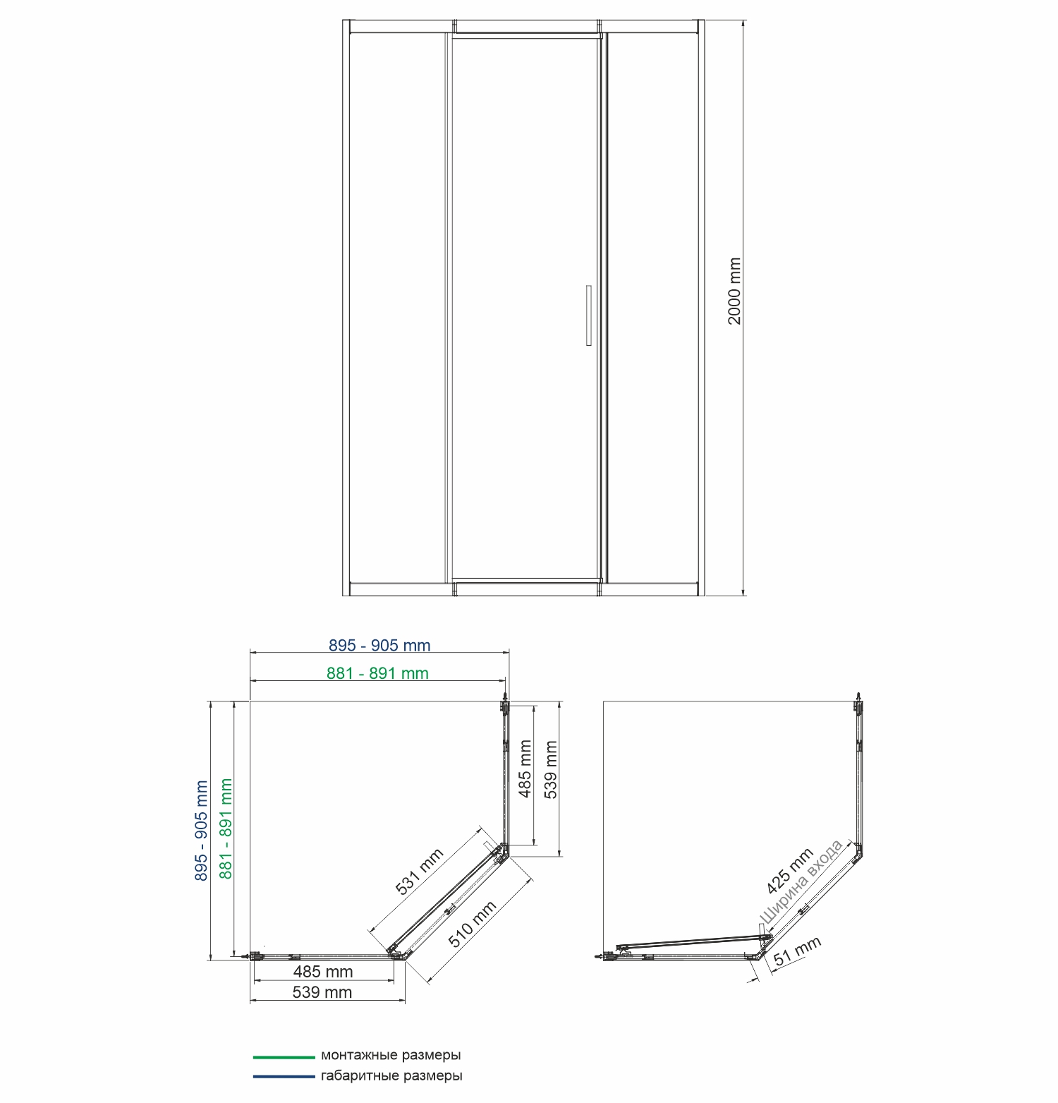 Габаритный размер 895-905 x 895-905 x 2000 , монтажный размер 881-891 x 881-891 x2000 Ширина входа 425