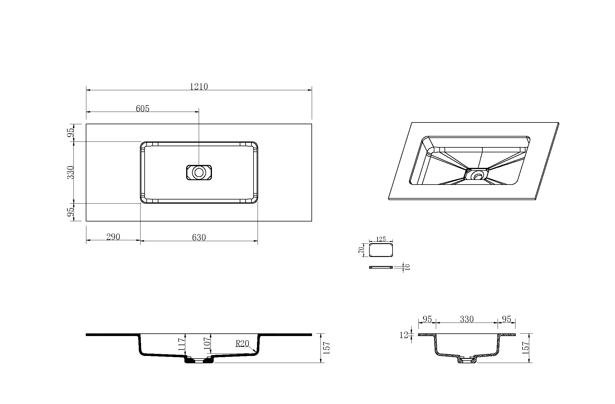 QUATRO 120 раковина-моноблок WHITE (чаша по центру) 1210*52*12 акрил