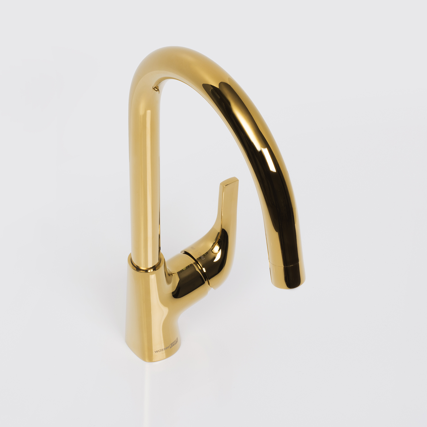 Корпус смесителей произведен из высококачественной латуни с содержанием меди не менее 59%. Латунь является наилучшим материалом для изготовления корпуса смесителей, характеризуется долговечностью и прочностью. PVD-покрытие "глянцевое золото"