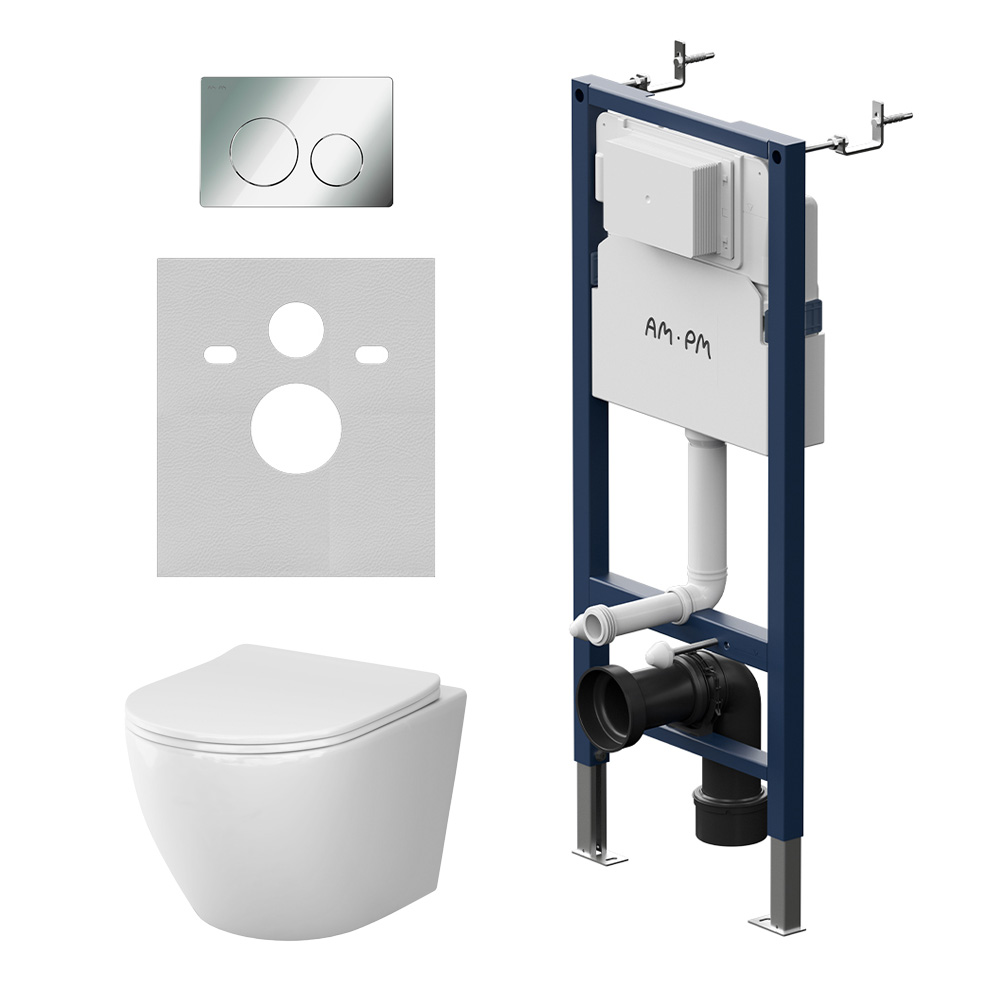 Полностью готовый к установке комплект: система инсталляции с клавишей подвесной унитаз с сиденьем включающий все необходимые крепления патрубки звукоизолирующую прокладку. Экономия пространства благодаря узкому бачку – 120 мм глубиной. Заливной клапан с низким уровнем шума - Класс II согласно европейского стандарта EN 14124.