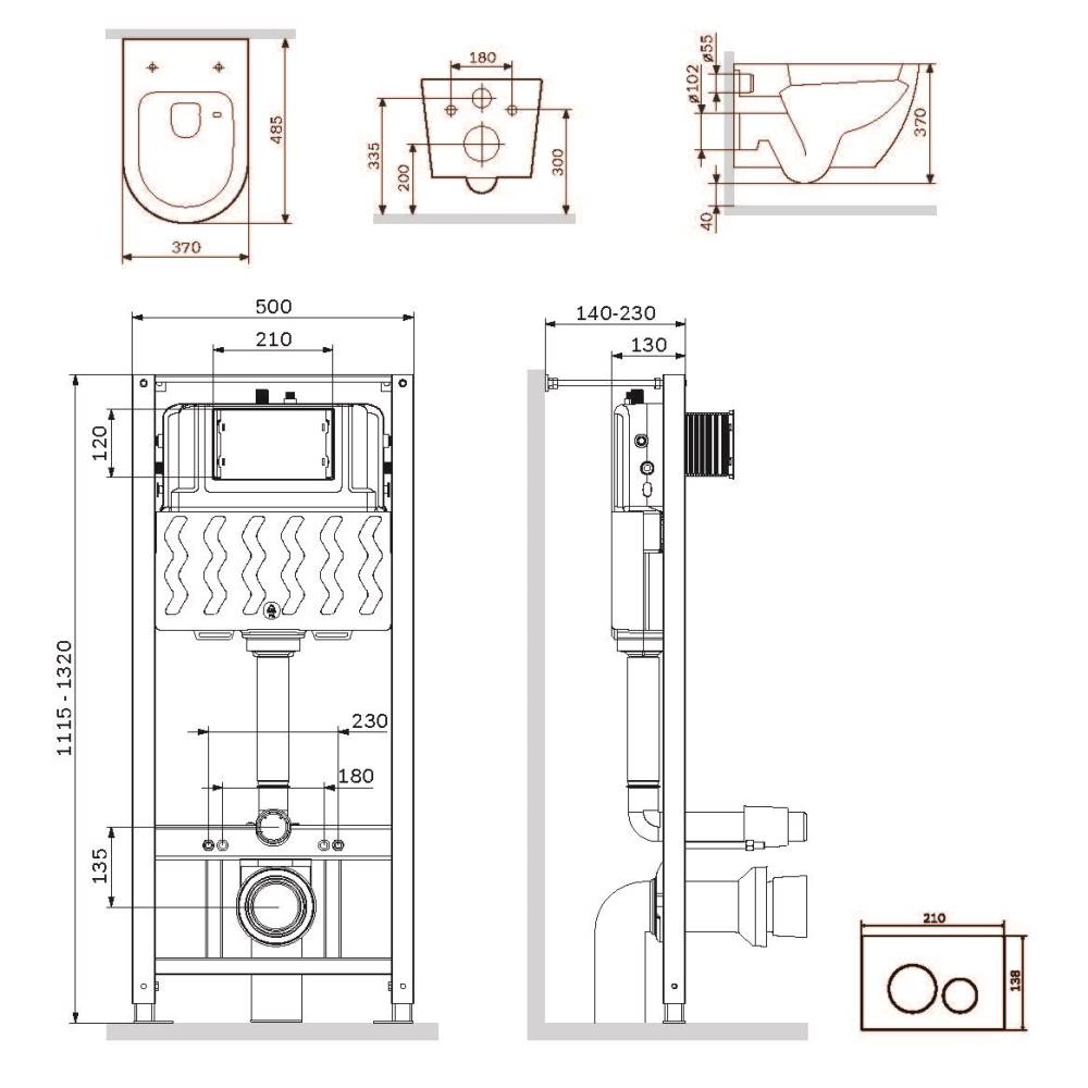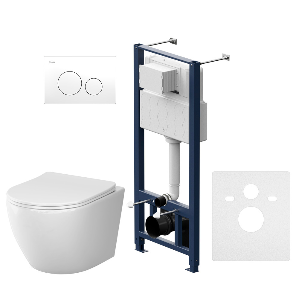 Полностью готовый к установке комплект: система инсталляции с клавишей подвесной унитаз с сиденьем. Неразборная рама из стального профиля выдерживает нагрузку до 400 кг.