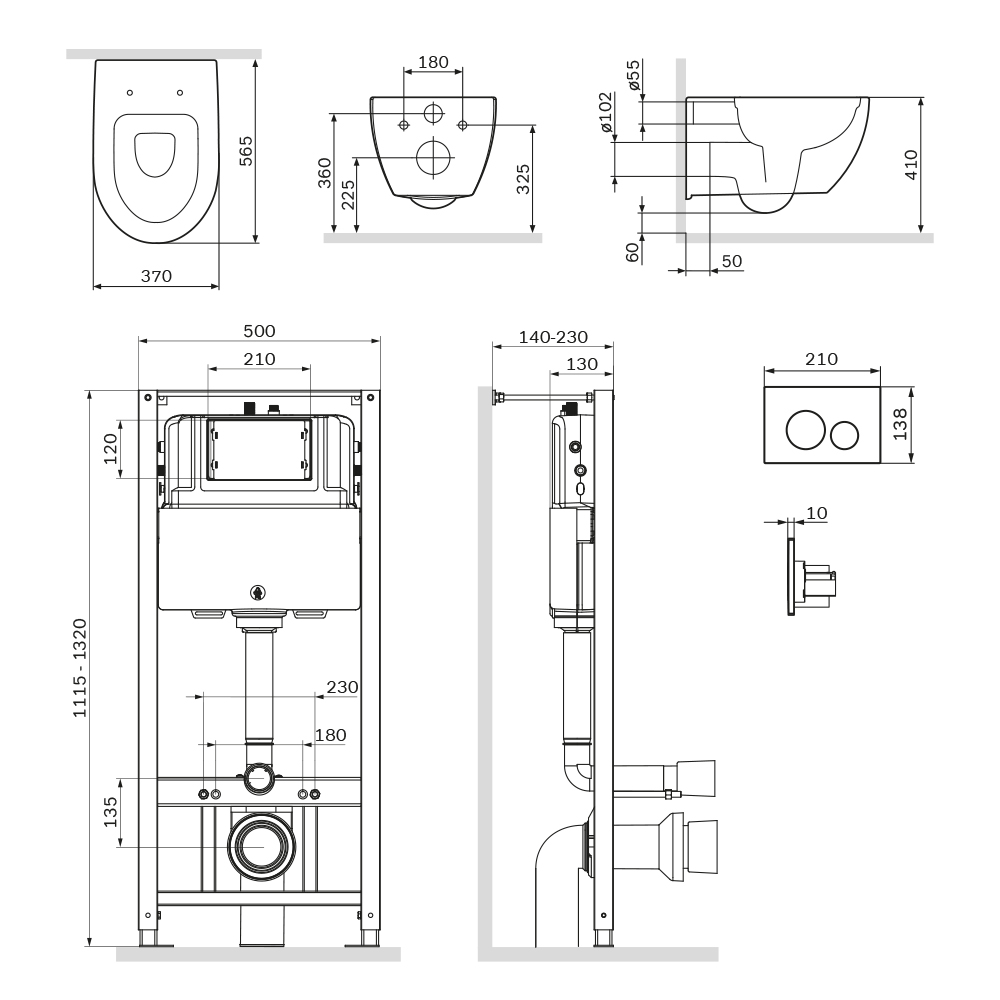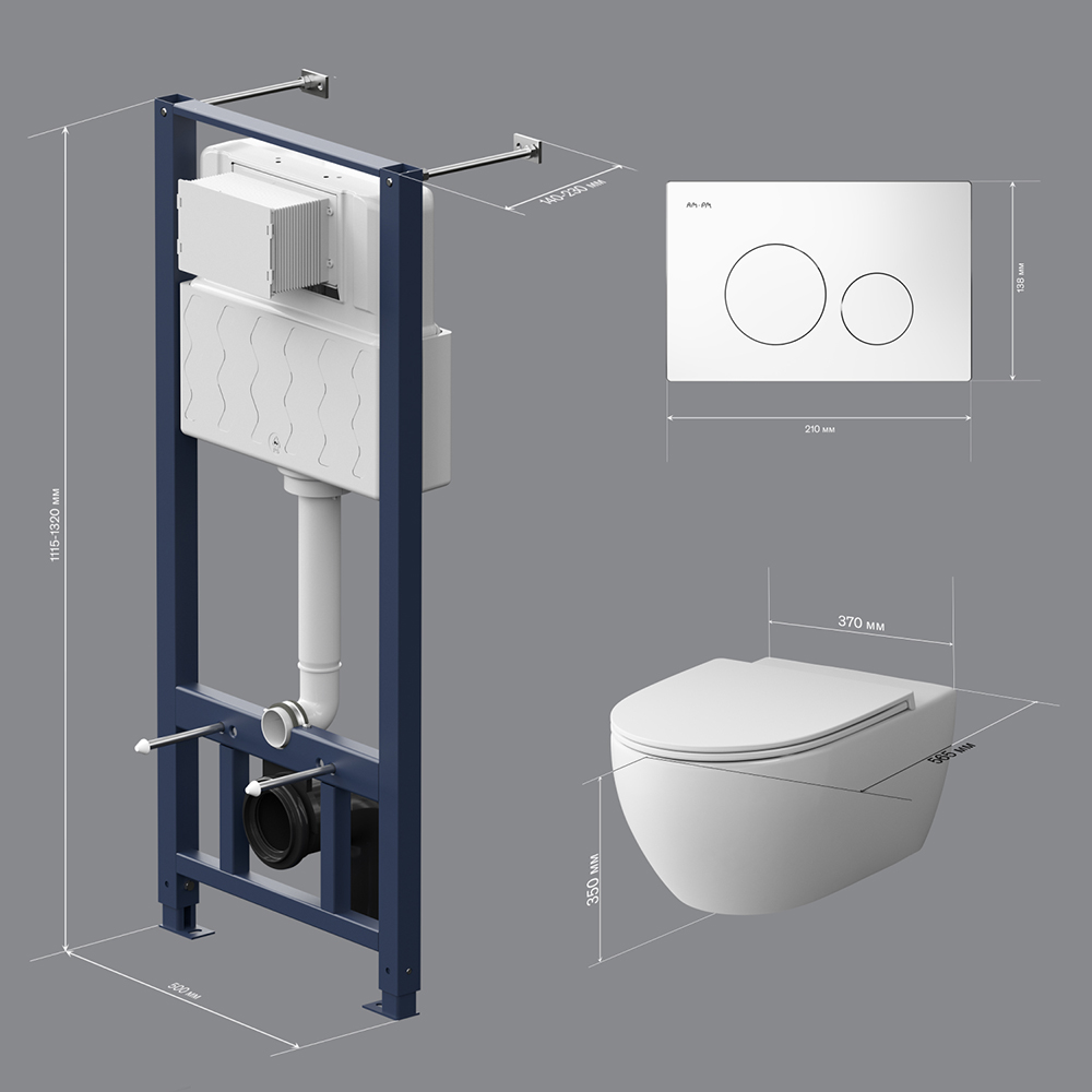 Полностью готовый к установке комплект: система инсталляции с клавишей подвесной унитаз с сиденьем. Неразборная рама из стального профиля выдерживает нагрузку до 400 кг. Полностью изолированный бачок с качественной двухрежимной смывной арматурой укомплектован пневматической клавишей в цвете белый. В комплекте все необходимые патрубки и крепления а также прокладка между унитазом и стеной - звукоизоляция.